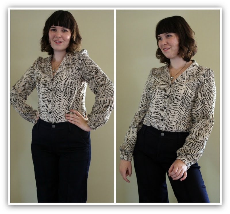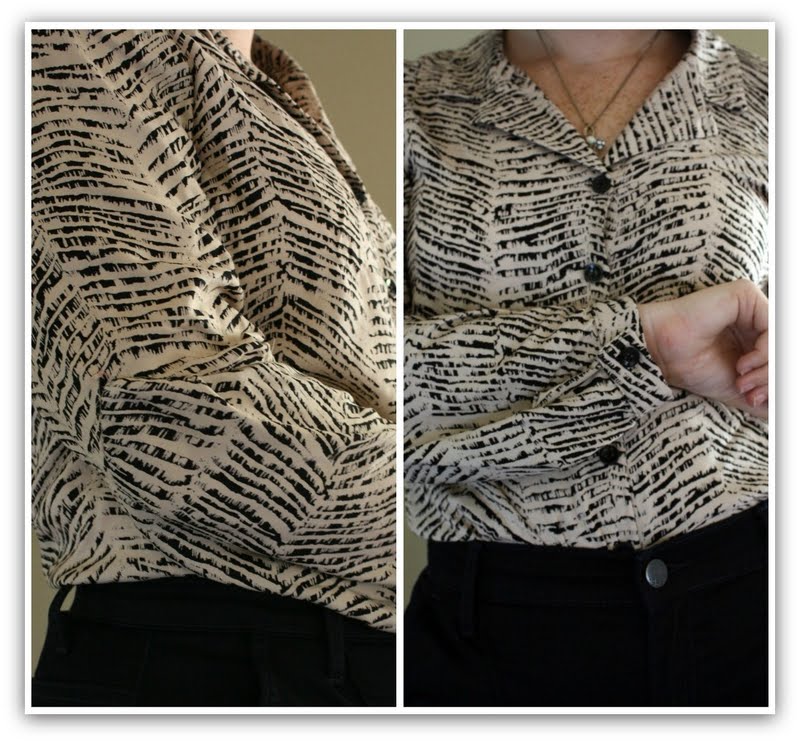 I sewed up the sleeves according to the pattern directions and attached them to the shirt bodice. Finally I switched over the old pearly coloured buttons for plain black ones. I would have had to get new buttons anyway beacause I needed two extra for the sleeve cuffs and I didn’t have any that matched the originals.