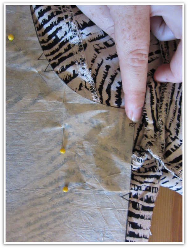 I was lucky that I had so much fabric in the skirt to use for my sleeves! Even then I still had do do some creative manouvering with pattern placement. when I took off the waistband and spread the skirt out it made one long rectangle, but there were several small darts and seams to contend with. I seam ripped the darts and worked around most of the seams. Luckily with the fabric design it is difficult to tell that there are seams there at all.