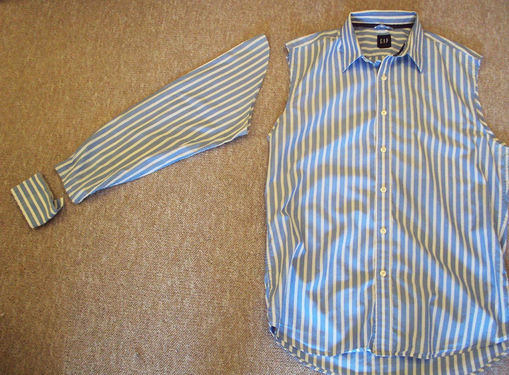 I started this refashion by removing the sleeves from the shirt and the cuffs from the sleeves, cutting carefully along the seam lines.