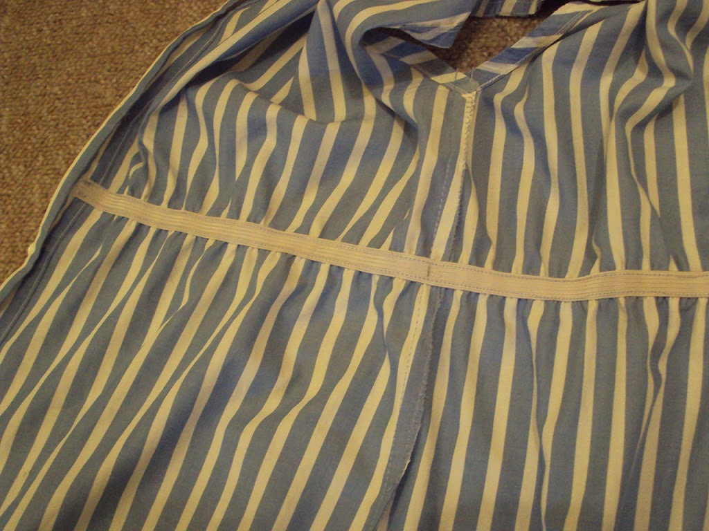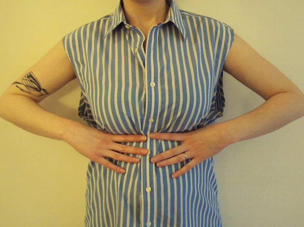 The inside of my top was now looking like this! At this point I would say it is a good idea to try your top on and see how the refashion is developing. If you chose an under bust line that didn’t align with the position of a button and button hole at the centre front, you may or may not experience a bit of gapping where the elastic is pulling the shirt. If you do have some gapping, hand stitch a press stud/popper to act as another button where the elastic stops and starts.