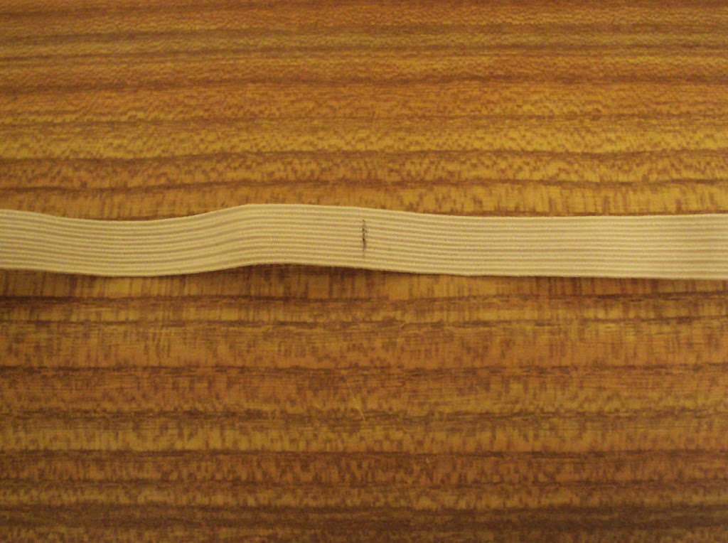 Now that I’d addressed the width of the garment, it was time to add the elastic to give the garment some shape. With a tape measure, I measured around my torso along the under bust line. I then took 3 cms (1â€) off that measurement and cut a piece of ½†wide elastic to this length. Folding the elastic in half and then in quarters, I marked these points on the elastic in pencil. (If you’re playing along at home, you will now have three small pencil marks along one side of the elastic.)