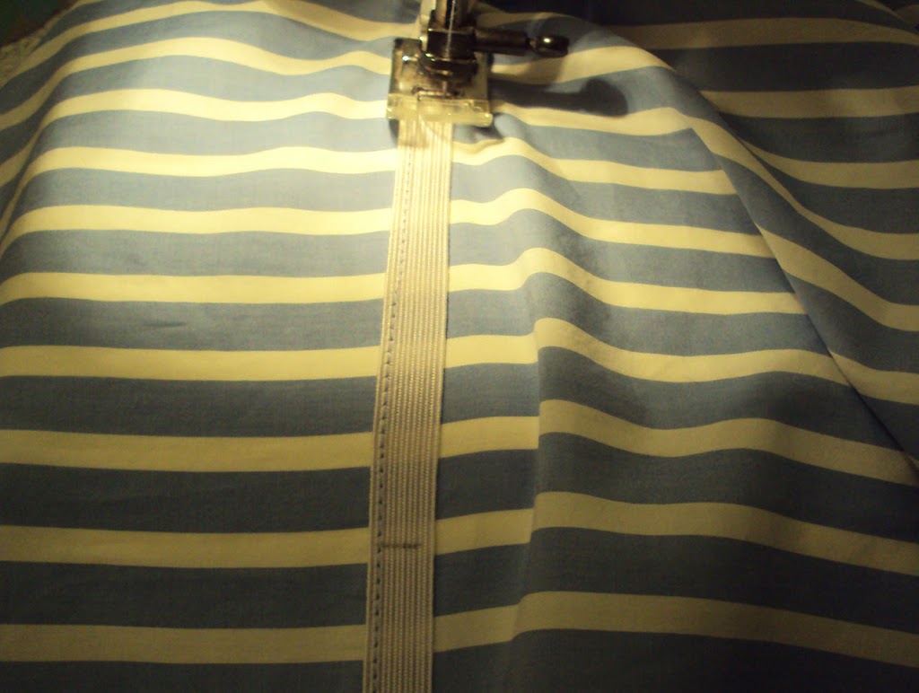 ‘Tis time to stitch the elastic down. Starting at one end of the elastic, I stitched two parallel lines along the edges of the elastic pulling the elastic as I stitched (once again for those playing at home, take your time with this stage, this can be a bit fiddly!). The elastic is meant to gather the fabric up evenly when stitched down and the tension is released.