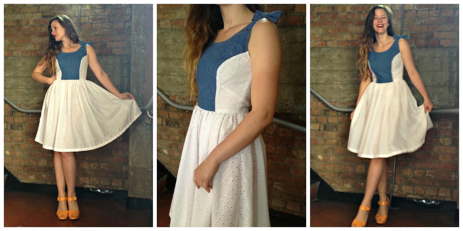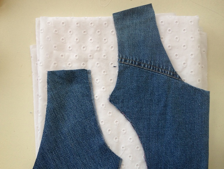 Oh, my, bloomin’ word! Back of the net Elisalex! Denim and broderie…a classic combo AND two new garments from one teensy denim shirt! Actually I concur. The denim shirt was actually quite nice to start off with and I’d toyed with the idea if embellishing the front and back yokes myself. Which was another option. But my refashioning pile was large enough as it was and I knew this would be in good hands. Love the substitution of the tulip skirt of the Elisalex dress, with a simple gathered one. Totally changes the vibe of the original pattern. “Pieced” patterns like this, where the garment element (ie bodice in this case) is assembled from several smaller pattern pieces, are a great way to use small bits of fabric harvested from garments. Especially when you opt for the contrasting fabrics route as Elisalex has done here. Â And you needn’t run off and buy a length of fabric to emulate the skirt section in this refashion either. Bag yourself a denim shirt from the clothing rail of your local charity shop…..then go off and peruse the linens section for some pure cotton (vintage floral??) bedlinens/vintage tablecloths…