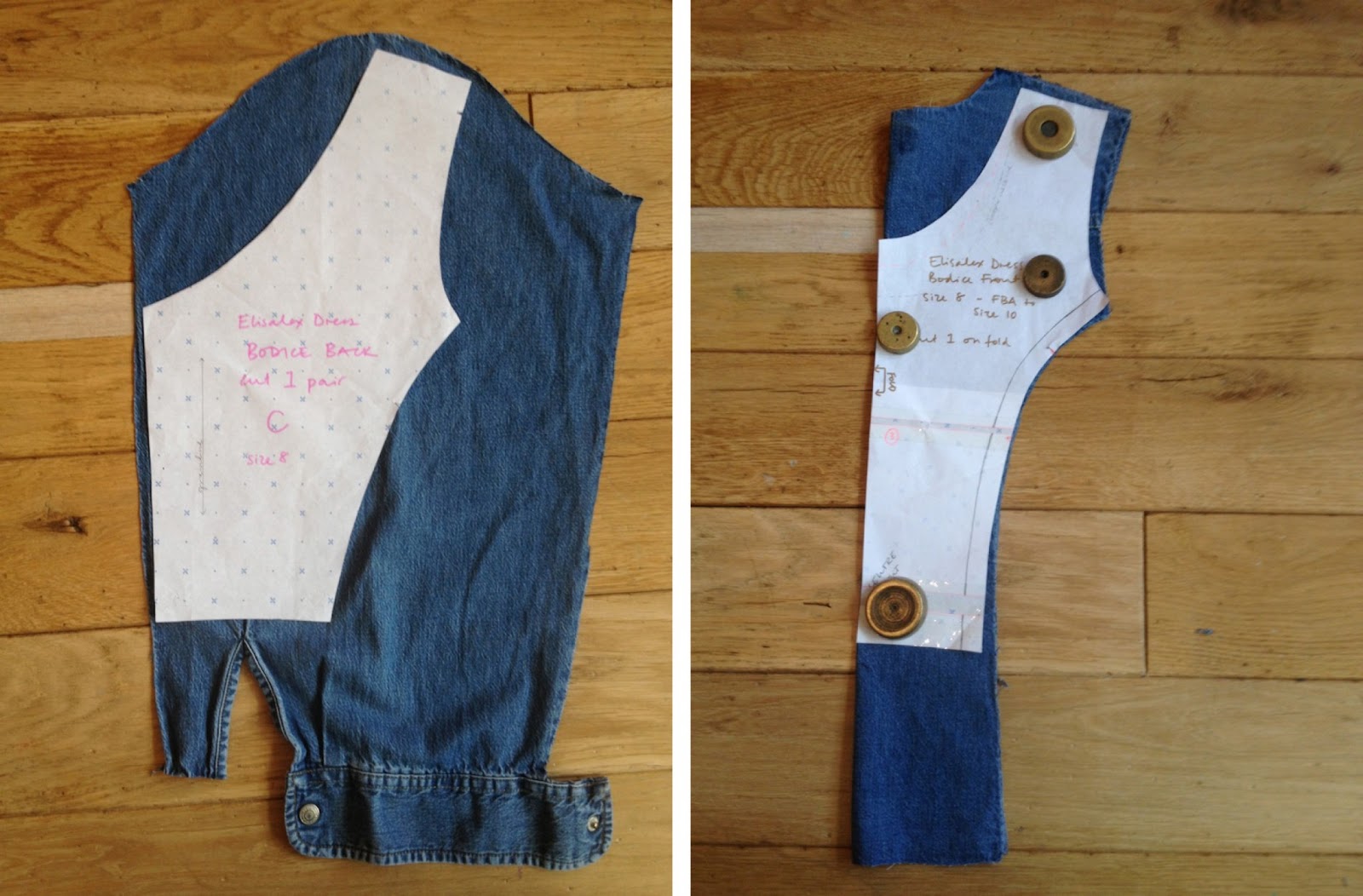 Shamelessly I went for my own namesake pattern, the Elisalex Dress, and only just managed to squeeze out the front and back bodice pieces from the sleeves and back panel of the shirt.