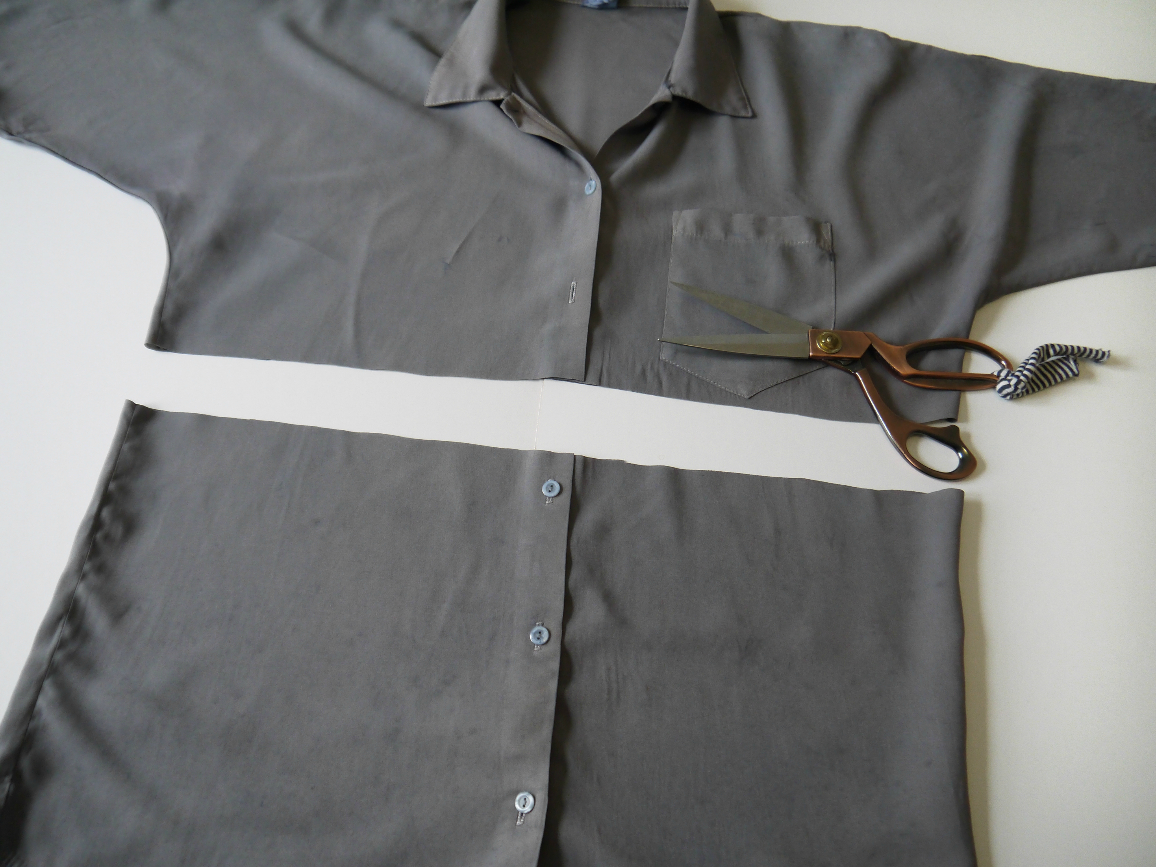 Cut the bottom half of the second shirt. Again, give yourself room to manoeuvre on the button plackets. (I ended up cutting about 1″ below that top button in the end)