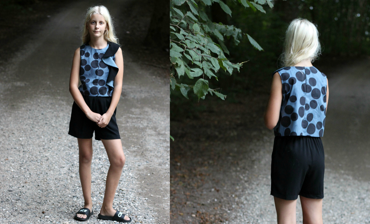 The outfit is inspired by the Spanish kid’s fashion brand ‘Motoreta’ ; with the top being made from a thrifted paneled blue skirt from her local thrift shop, and the shorts from a previously me made skirt …